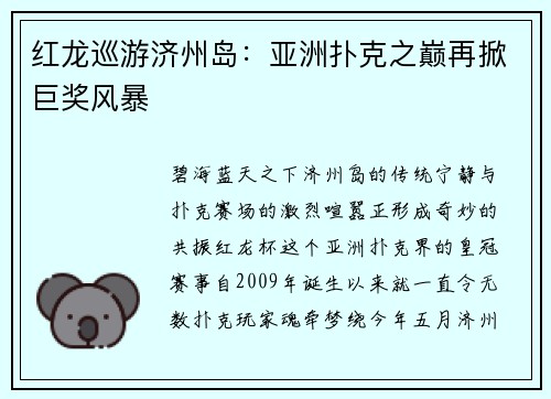 这听起来是一场令人兴奋的扑克盛会!根据我查到的信息,你关注的 2025年在济州岛举办的红龙杯主赛事已经全部圆满结束了。 下面为你梳理了2025年红龙杯在两季赛事中的核心信息,可以帮助你全面了解去年的赛...