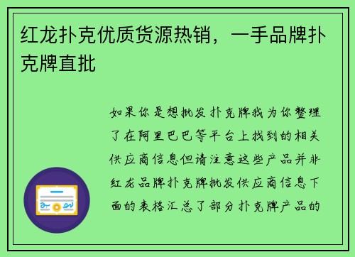 关于“红龙扑克”和“红龙王牌:巅峰争霸赛”,目前网络上的信息比较混杂,并没有关于这场“巅峰争霸赛”的官方确切消息。我可以根据现有的资料为你介绍一下“红龙扑克”及其相关的知名赛事。 认识红龙扑克赛事 ...